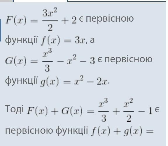 Тоді F( x ) + G( x ) = x³/3 + x²/2 - 1 є первісною функції