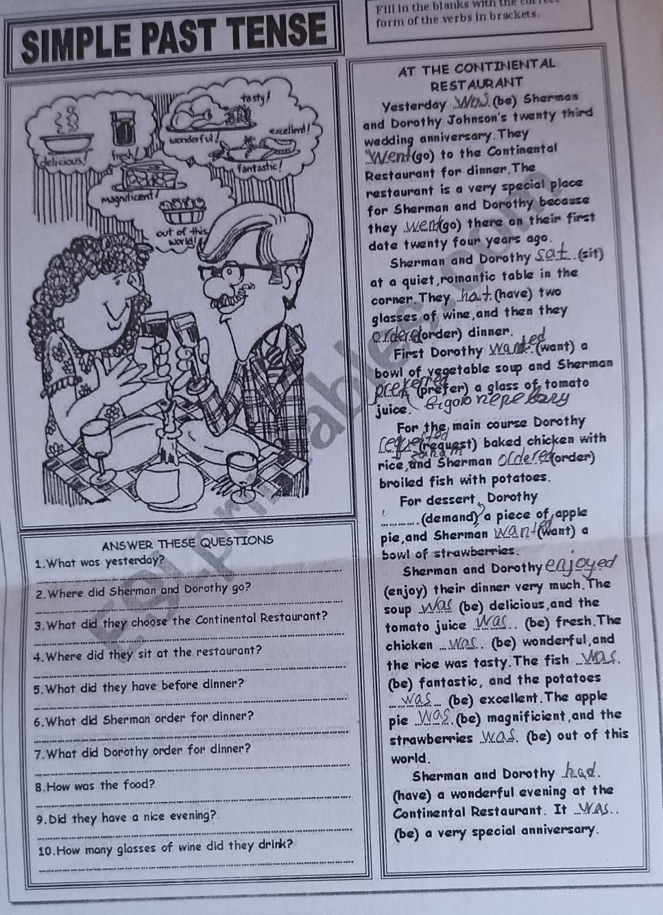 Вчера была двадцать третья годовщина свадьбы Шермана и Дороти Джонсон. Они пошли в ресторан «Континенталь» на ужин. Этот ресторан — особенное место для Шермана и Дороти, потому что они ходили туда на свое первое свидание двадцать четыре года назад.