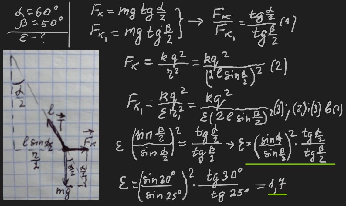 Двi однаковi кульки пiдвiшенi на закрiплених в однiй точцi нитках однакової довжини, заряди ли однаковими одной менними зарядами. Кульки вiдштовхнулися, i кут мiж ни ми став дорiвнювати 60°. Пiсля занурення кульок у рiдкий дiелектрик, кут мiж ними зменшився до 50°. Знайти дiелектричну проникнiсть середовища. Виштовхувальною силою знехтувати.