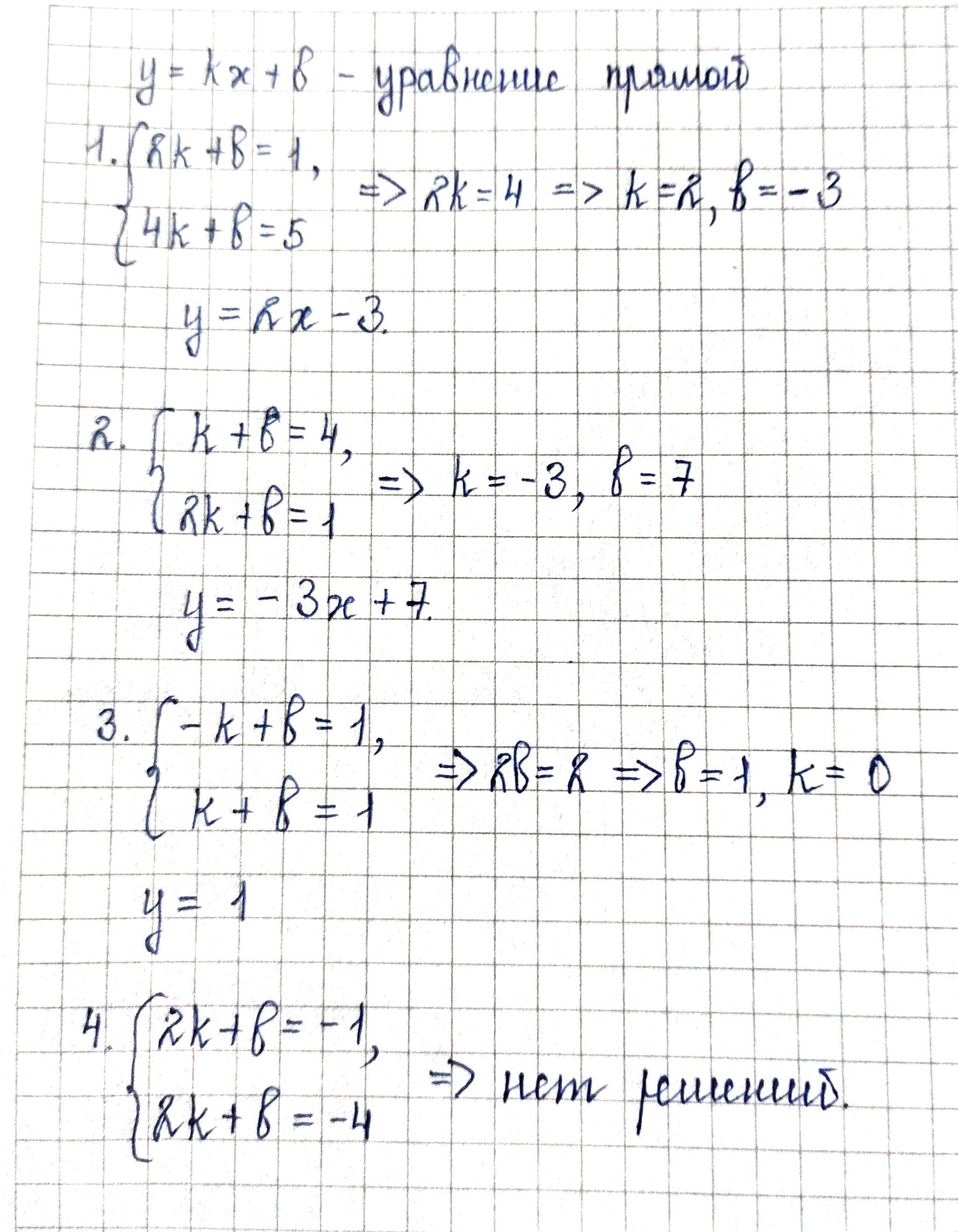 Запишите уравнение прямой проходящей через точки 1) А (2;1) и B (4;5) 2) A (1;4) B (2;1) 3)A (-1;1 B (1;1) 4) A (2;-1) B(2;-4)