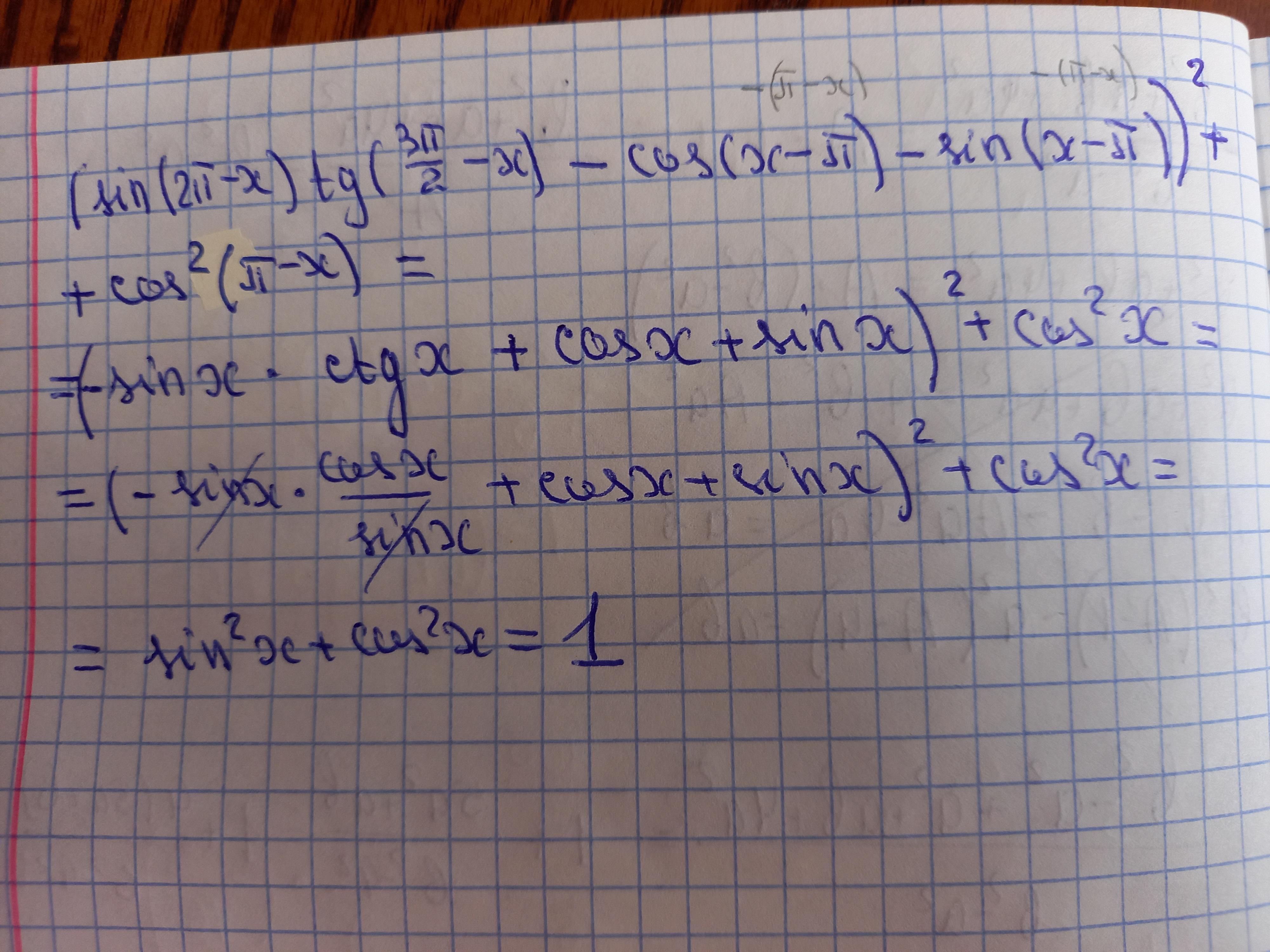 (sin (2π-x) tg( 3π/2-x) -cos(x-π)-sin (x-π))2 + cos2(π-x)