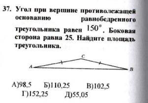 Угол при вершине противолежащей основанию равнобедренного треугольника равен 150. Боковая сторона равна 25. Найдите площадь треугольника