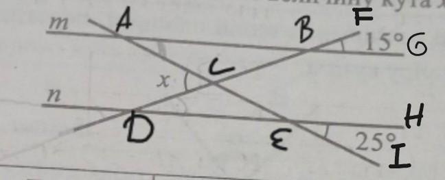 Дивiться фото. <АВС=<FBG=15°(як вертикальнi); <CED=<HEI=25°(як вертикальнi); <BAC=<CED=25°(як внутрiшнi нахрест лежачi); <АСВ=180-(<АВС+<ВАС)=180-(15+25)=180-40=140°(за т. про суму кутiв трикутника); => <АСD=180-<ACB=180-140=40°(за аксiомою iзмiрення кутiв).