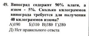 Виноград содержит 90% влаги а изюм - 5% Сколько килограммов винограда требуется для получения 40 кг изюма?