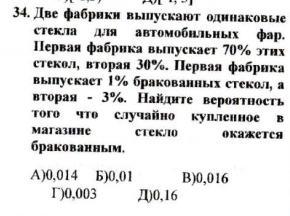 Две фабрики выпускают одинаковые стекла для автомобильных фар. Первая фабрика выпускает 70% этих стекол вторая 30%. Первая фабрика выпускает 1% бракованных стекол а вторая 3%. Найдите вероятность того что случайно купленное в магазине стекло окажется бракованным.
