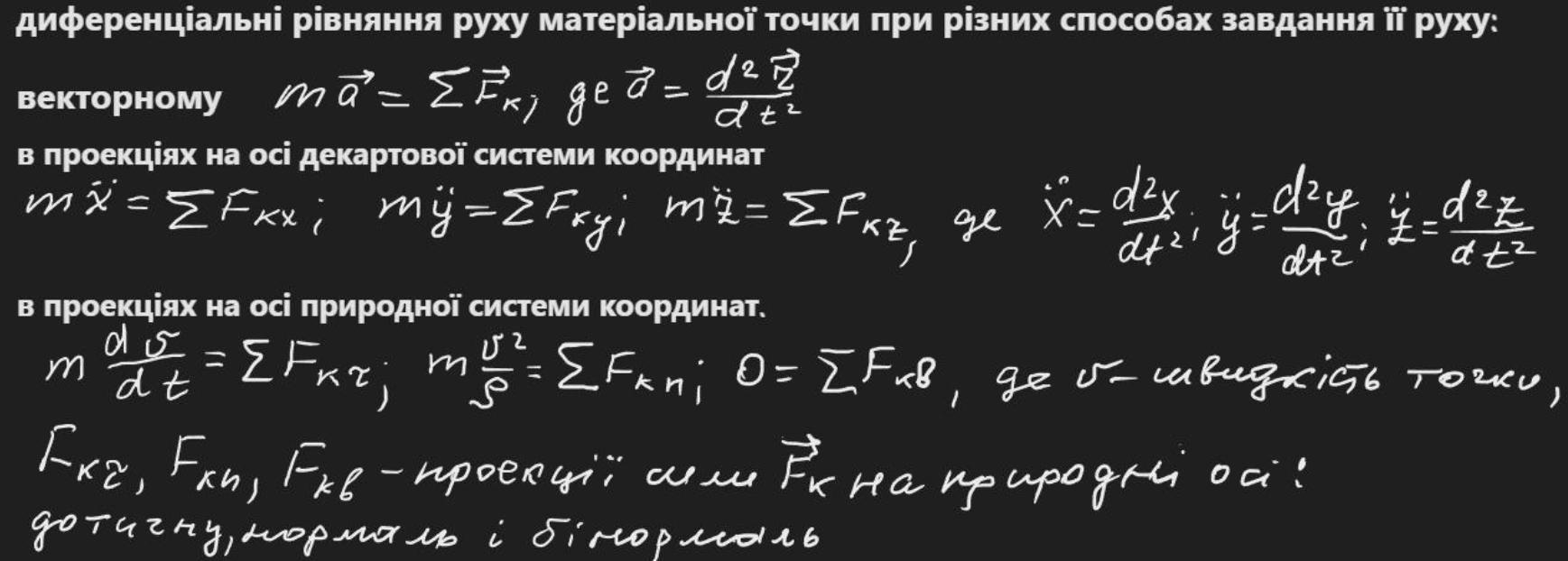 Запишіть диференціальні рівняння руху матеріальної точки при різних способах завдання її руху: векторному, в проекціях на осі декартової системи координат і в проекціях на осі природної системи координат.
