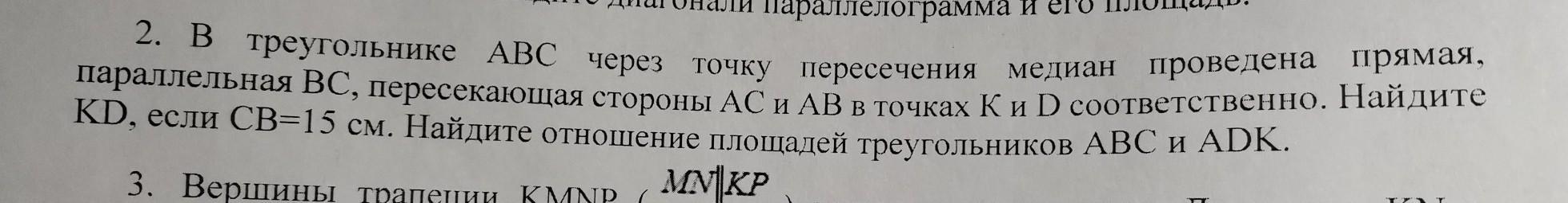 Медианы точкой пересечения делятся в отношении 2:1 начиная от вершины. k=2/(2+1)=2/3; KD=CB*2/3=15*2/3=10