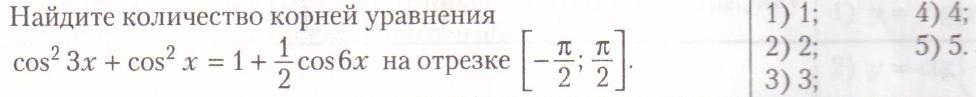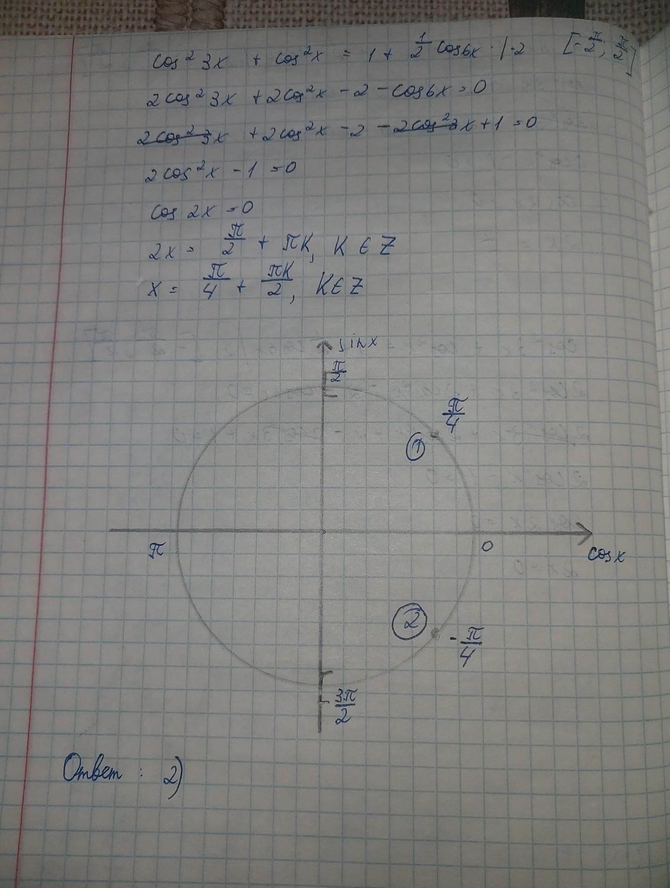cos² 3x + cos² x = 1 + 1/2 · cos6x на отрезке [ -π/2 ; π/2 ]
