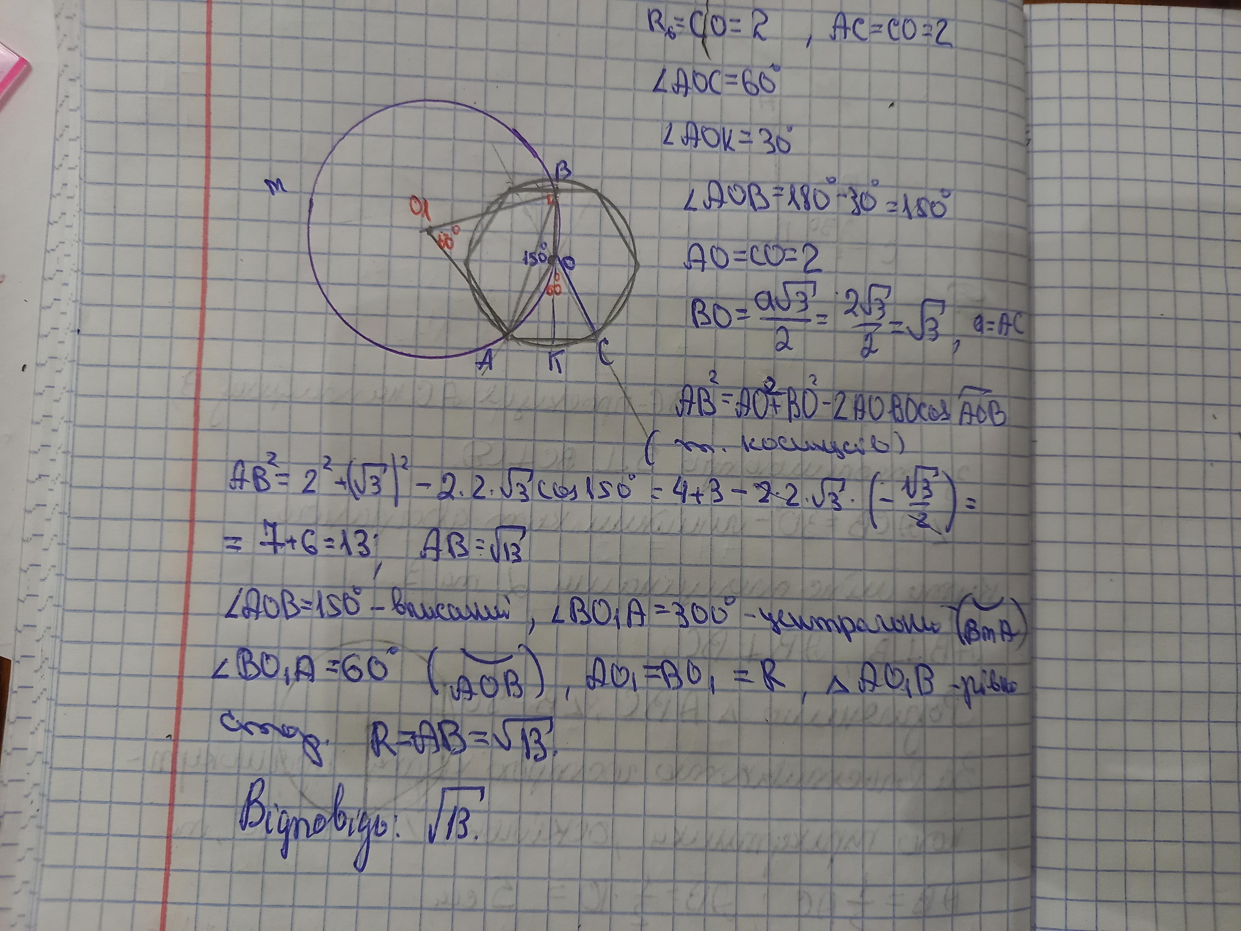 вроде устная задача ( корень из 13 ) , окружность описана около треугольника , стороны котоого легко вычисляются , а больший угол 150