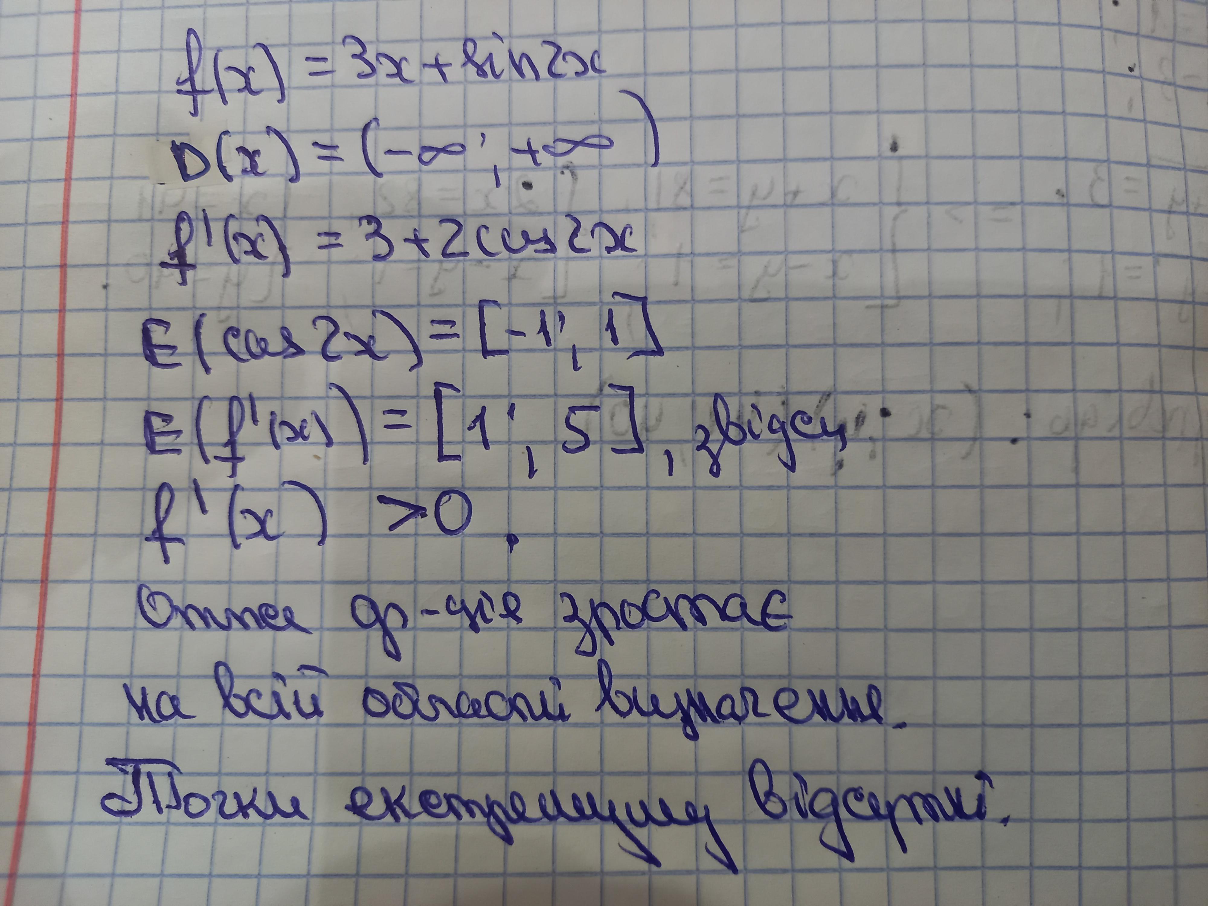 знайдіть проміжки зростання і спадання та точки екстремуму функції f(x) = 3x + sin 2x? Будь-ласка поясніть як це робити?
