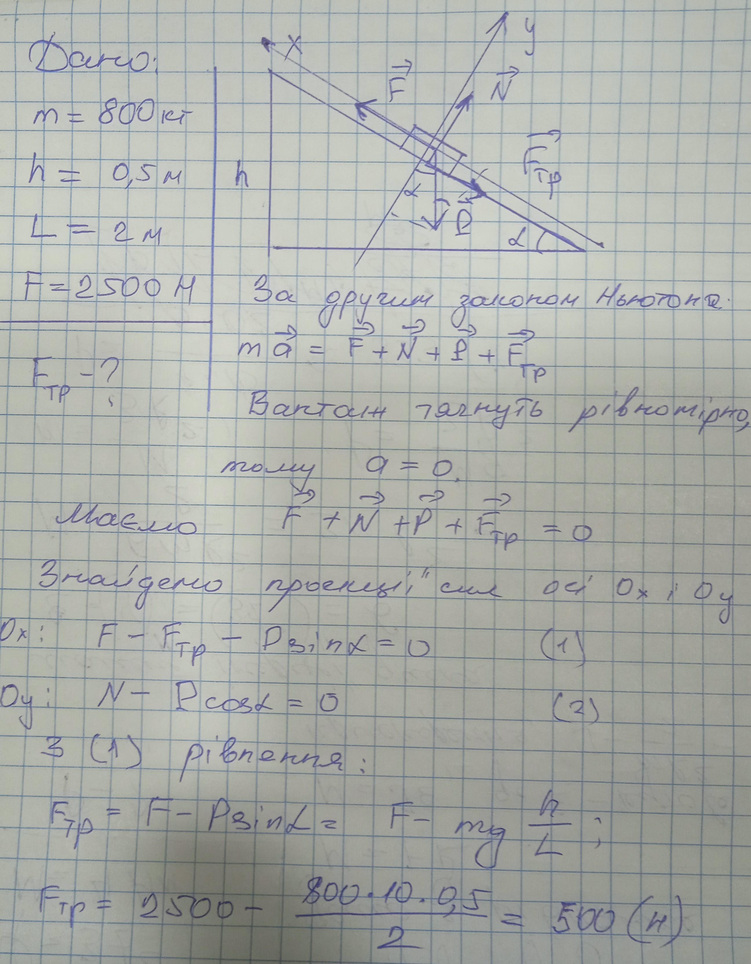 якої 2 м і висота 0,5 м, потрібна сила 2500 Н. Визначити силу тертя. Вважати