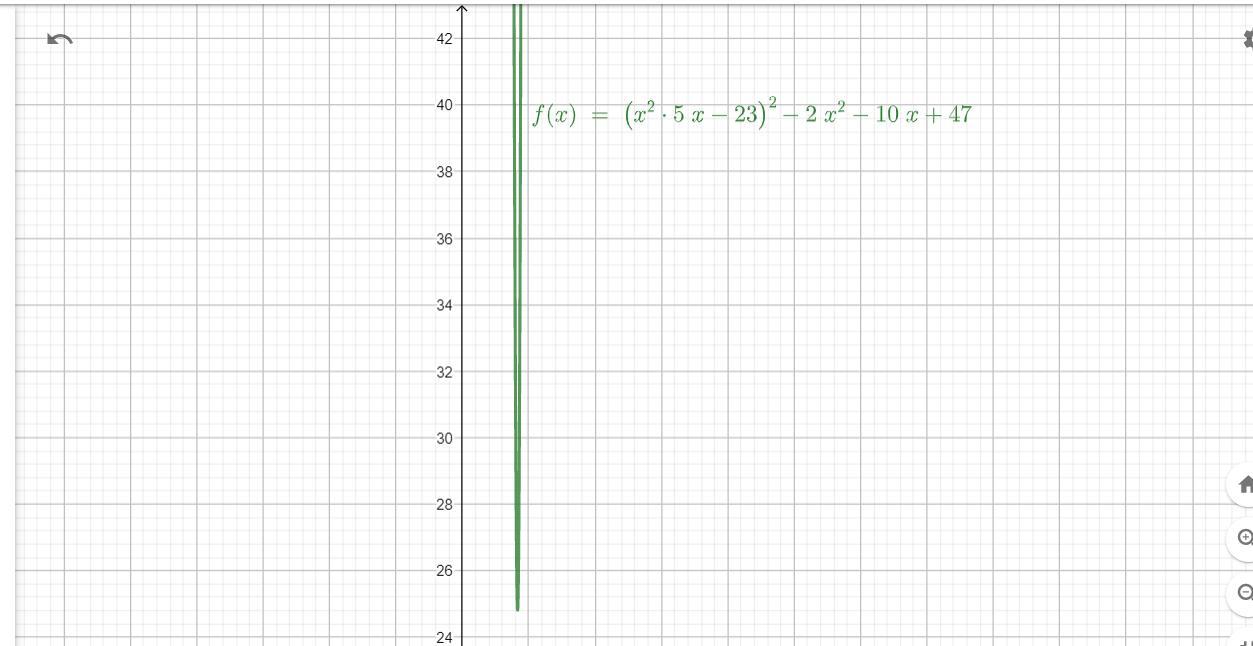 Если решать графически уравнение ( x² - 5x - 23 )² - 2x² - 10x + 47 = 0 , то по графику видно что нет пересечений с осью Ox , а значит действительных корней нет