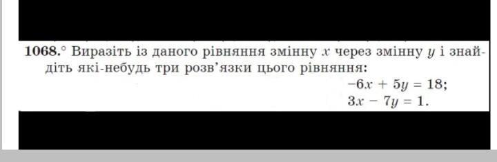 -6х+5у=18, х=(18-5у) /(-6), х=-3+5/6*у => а) у=6, х=2; б) у=12 , х=7; в) у=0, х=-3.