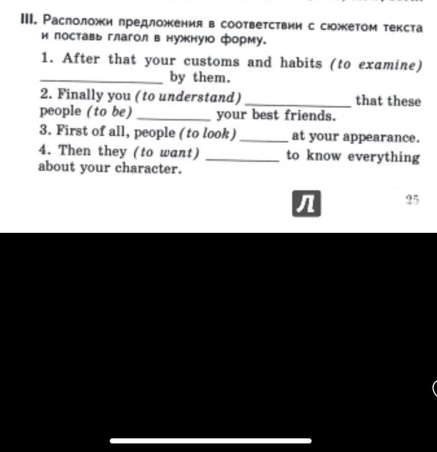 III. Расположи предложения в соответствии с coжeTom Teкста и поставь глагол в нужную форму. 1. After that your customs and habits (to examine) by them. 2. Finally you (to understand) people (to be) 3. First of all, people (to look). 4. Then they (to want) about your character. your best friends. that these at your appearance. to know everything помогите