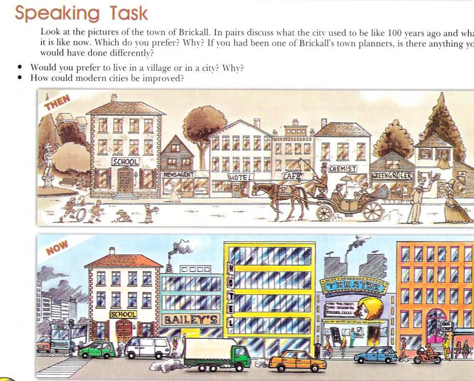 - A hundred years ago, buildings in the town of Brickall were significantly lower. Also, there weren't any theatres but there was a café, a chemist's and a greengrocer's. Nowadays, there are a lot of factories but no trees, and people use cars instead of horses and carriages. Personally, I like how the town looks like now; it seems bustling and full of life. However, if I had been one of the town's planners, I would have reduced the number of factories, increased the number of parks and made the town of Brickall eco-friendlier.