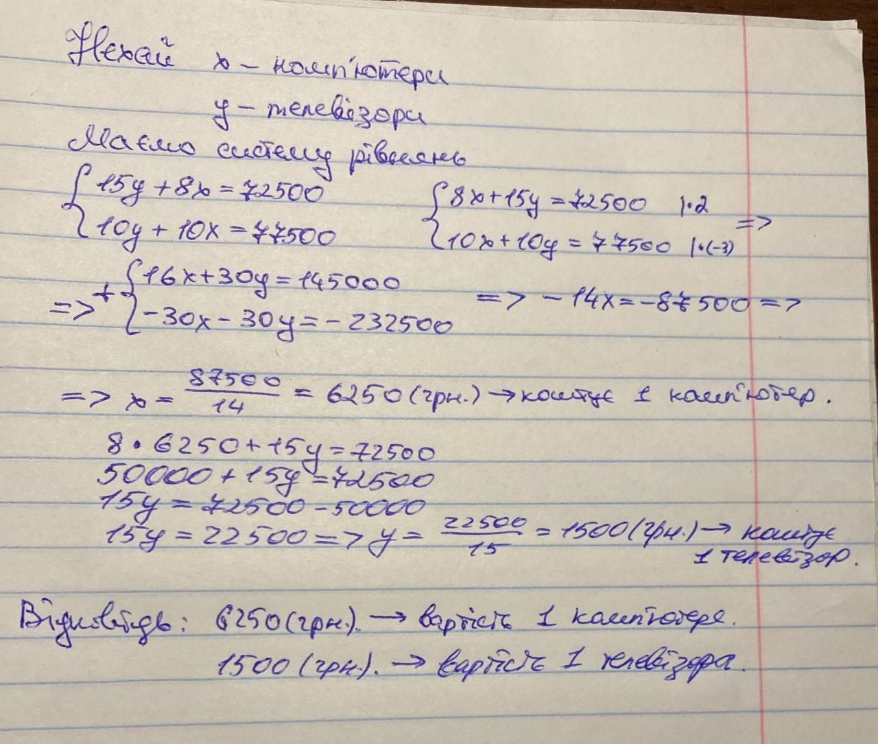 15 телевізорів і 8 комп’ютерів коштують разом 72 500 грн., а таких самих 10 телевізорів і 10 комп’ютерів коштують 77 500 грн. Скільки коштує телевізор і скільки комп’ютер? Будь-ласка Треба систему рівнянь….