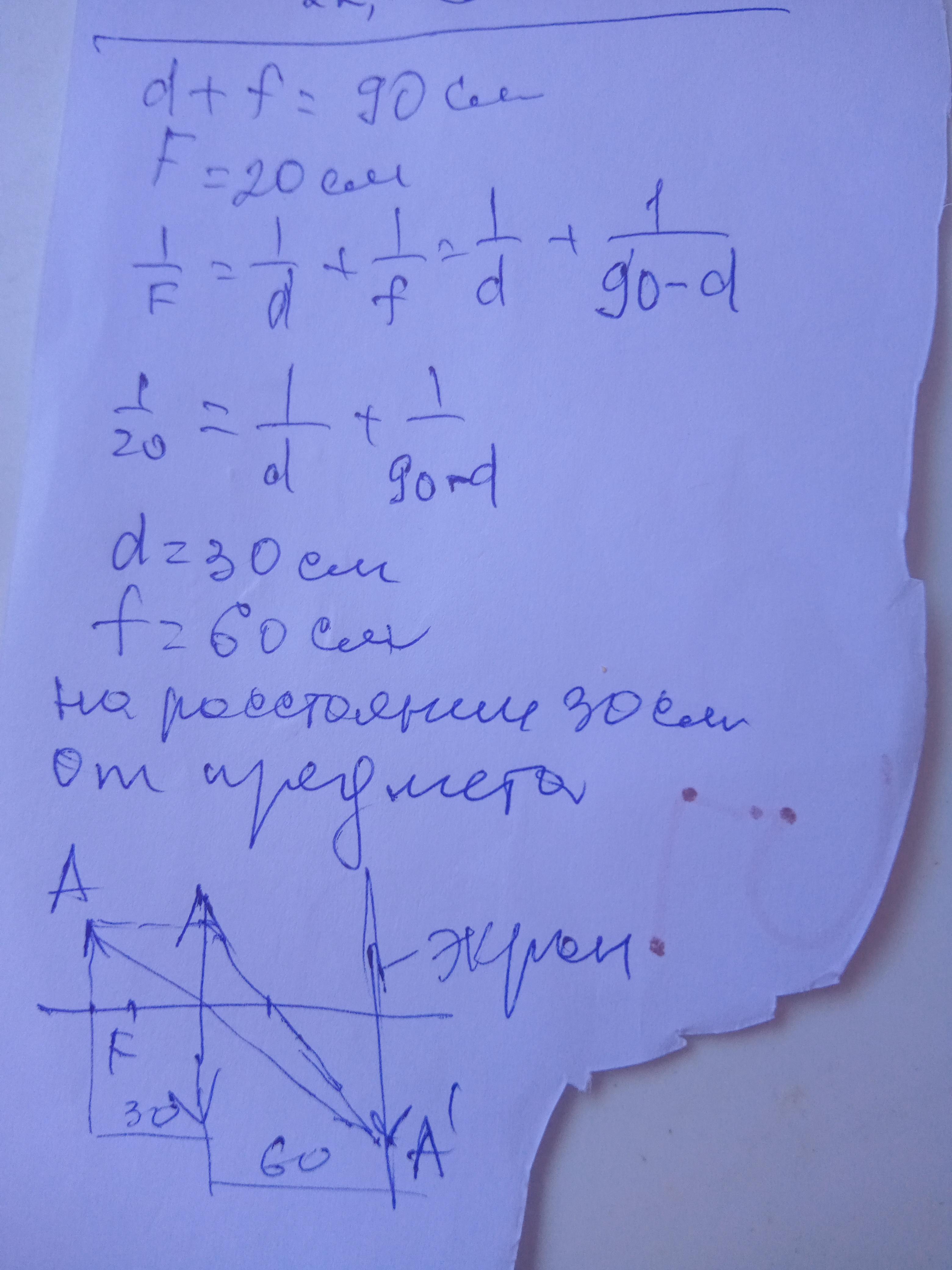 Відстань між предметом і екраном 90 см. Де потрібно розмістити збиральну лінзу з фокусною відстанню 20 см, щоб на екрані одержати чітке зображення предмета?