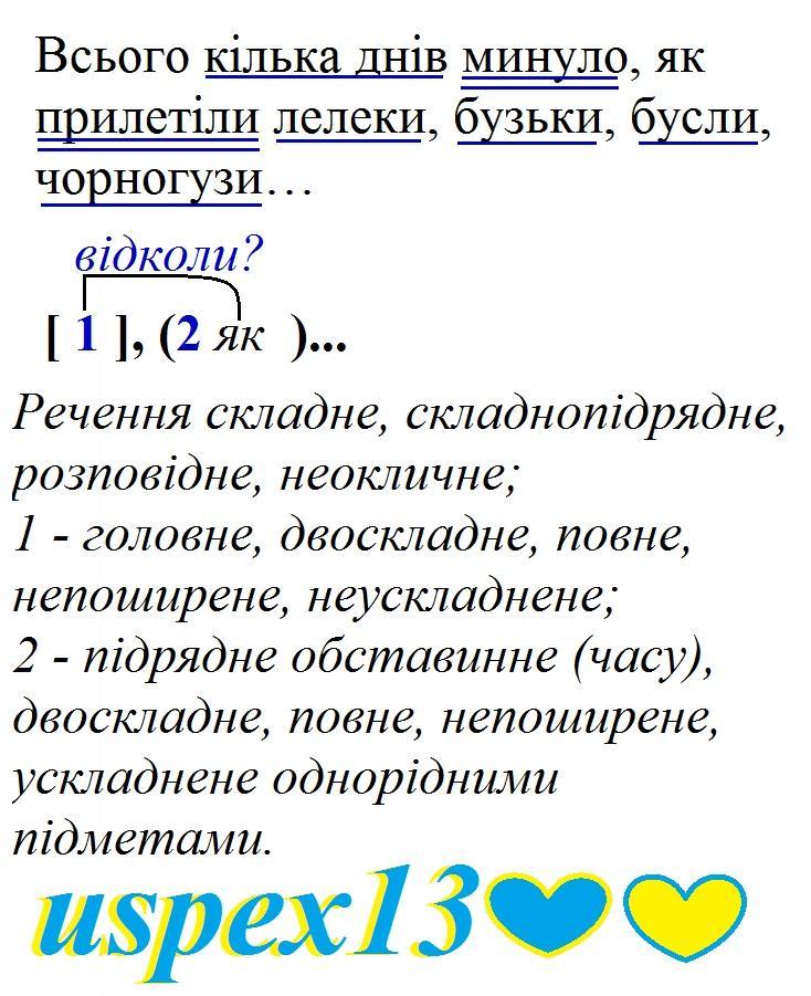 Зробіть синтаксичний розбір складнопідрядного речення: Всього кілька днів минуло, як прилетіли лелеки, бузьки, бусли, чорногузи…