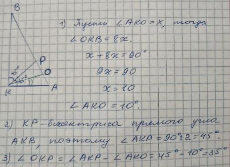 луч КО делит прямой угол АКВ на два угла, градусные меры которых относятся как 8 : 1 Найдите угол между лучом КО и биссектрисой угла АКВ. помогите:)