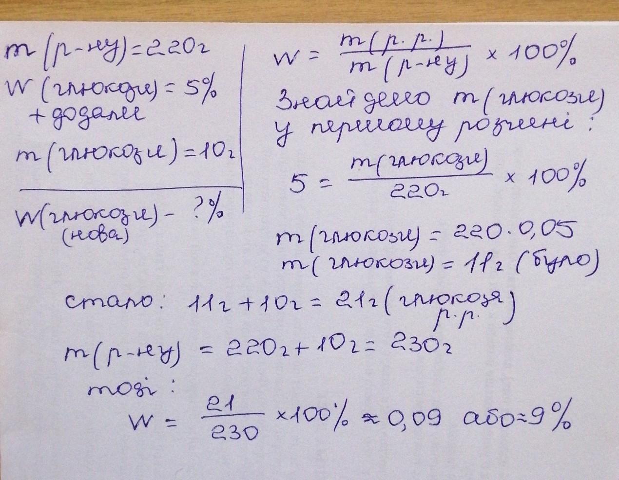 Допоможіть будь ласка!) До розчину 220 г з масовою часткою глюкози 5% додали глюкозу масою 10г, Обчисліть масову частку розчиненої речовини в утвореному розчині