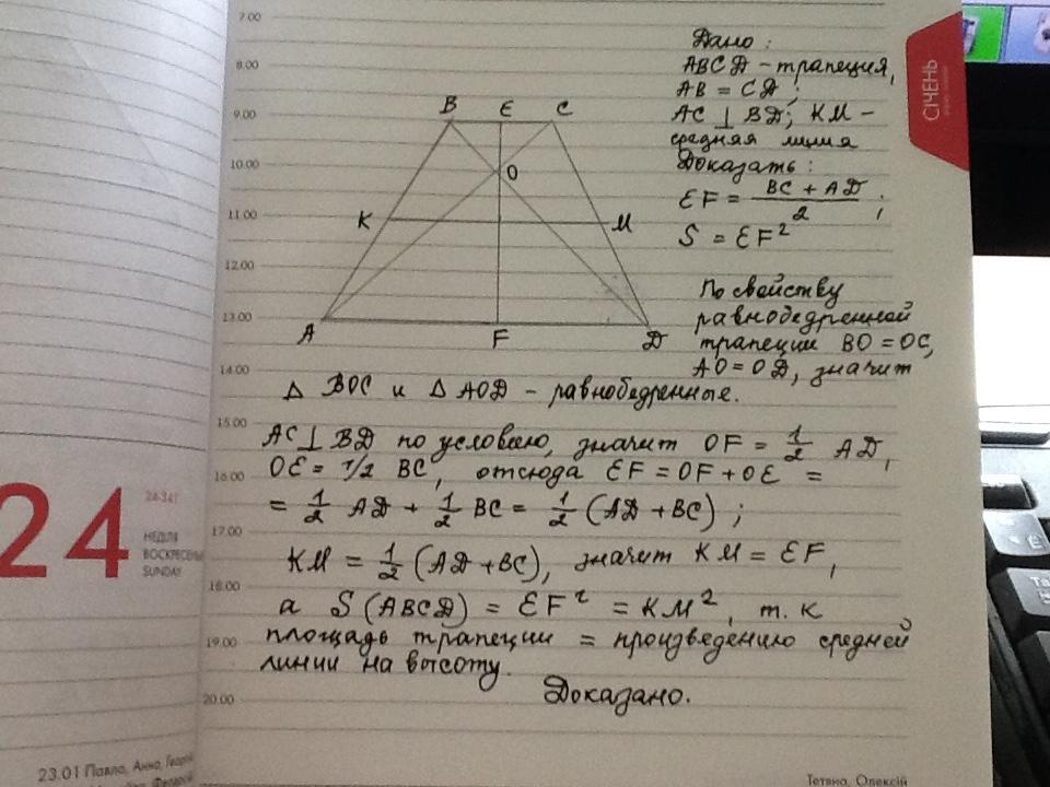 Если в равнобедренной трапеции диагонали перпендикулярны, то площадь трапеции равна квадрату высоты трапеции