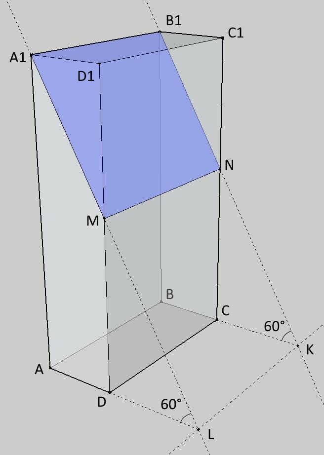 Прямая сечения, проведенная из точки A1 пересекает прямую AD в некоторой точке L, причем ∠A1LA = 60°.