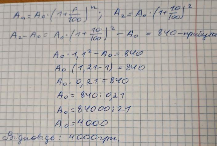 скільки тисяч гривень було покладено в банк, якщо через 2 роки прибуток становив 840 грн за 10% річних