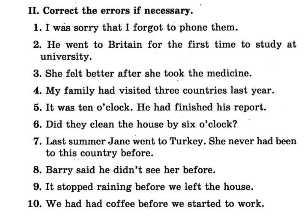 II. Correct the errors if necessary. 1. I was sorry that I forgot to phone them. 2. He went to Britain for the first time to study at university. 3. She felt better after she took the medicine. 4. My family had visited three countries last year. 5. It was ten o'clock. He had finished his report. 6. Did they clean the house by six o'clock? 7. Last summer Jane went to Turkey. She never had been to this country before. 8. Barry said he didn't see her before. 9. It stopped raining before we left the house. 10. We had had coffee before we started to work.