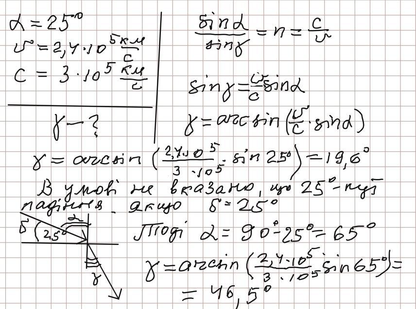 На поверхню рідини падає промінь під кутом 25°. Визначити кут заломлення променя, якщо швидкість світла в рідині дорівнює 2,4• 105 км/с.