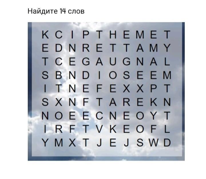 Это задание примечательно тем, что при желании найти можно больше 14 слов. Поэтому прикрепляю две картинки. На первой - 14 слов, которые, как мне кажется, и надо было найти. Однако, на всякий случай прикрепляю вторую картинку - если что-то из них не подойдет.
