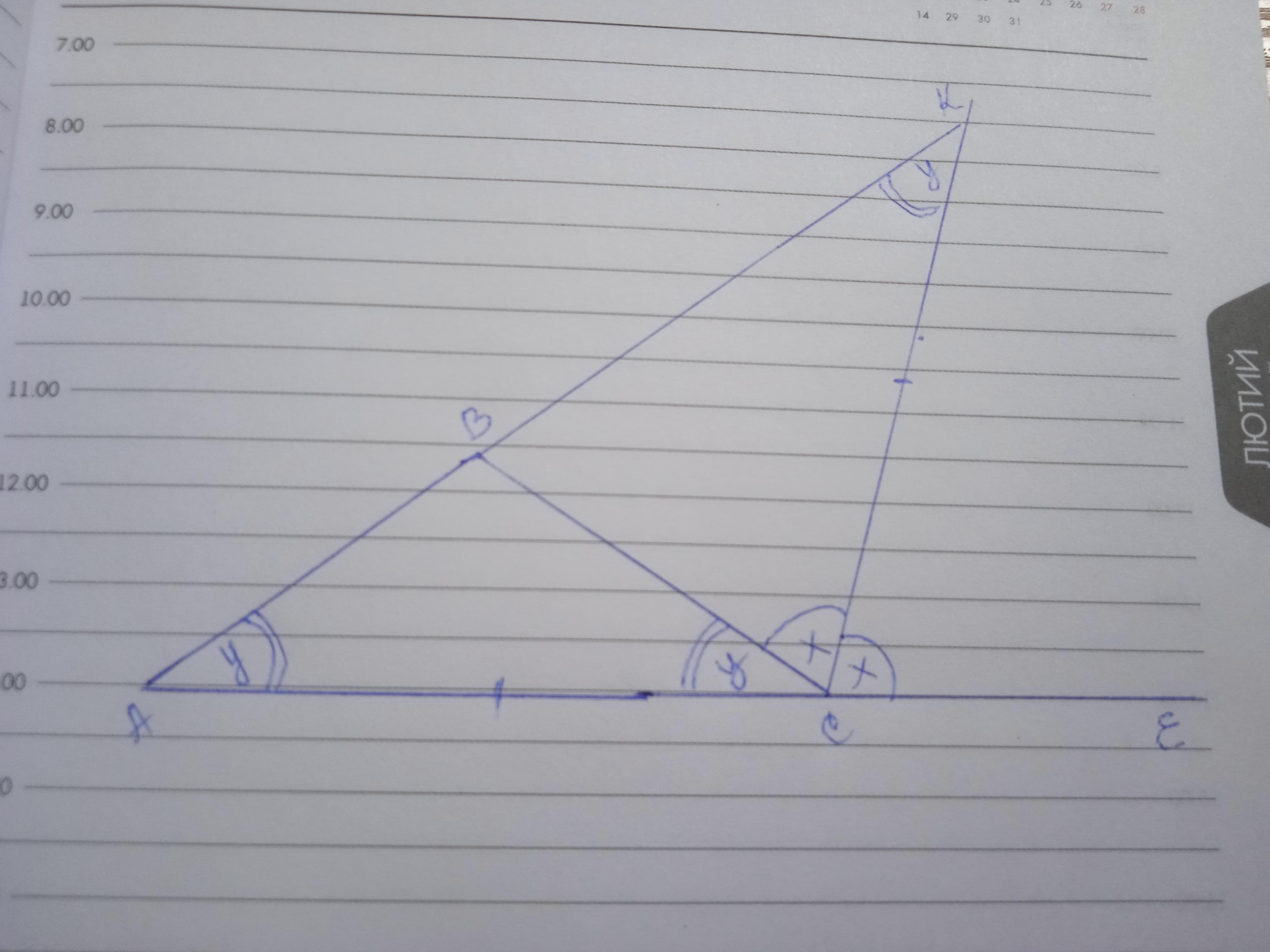 Бісектриса зовнішнього кута при основі рівнобедреного трикутника перетинає продовження бічної сторони під кутом, який дорівнює куту при основі трикутника. Знайдіть кути три- трикутника.