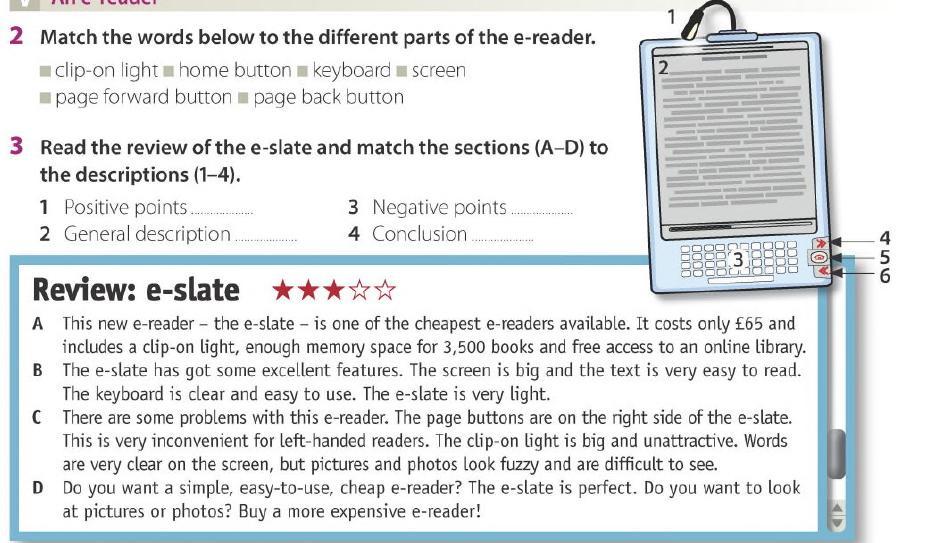 1-B (Positive features - перечисляются плюсы устройства: большой экран, удобная для использования клавиатура, малый вес читалки)