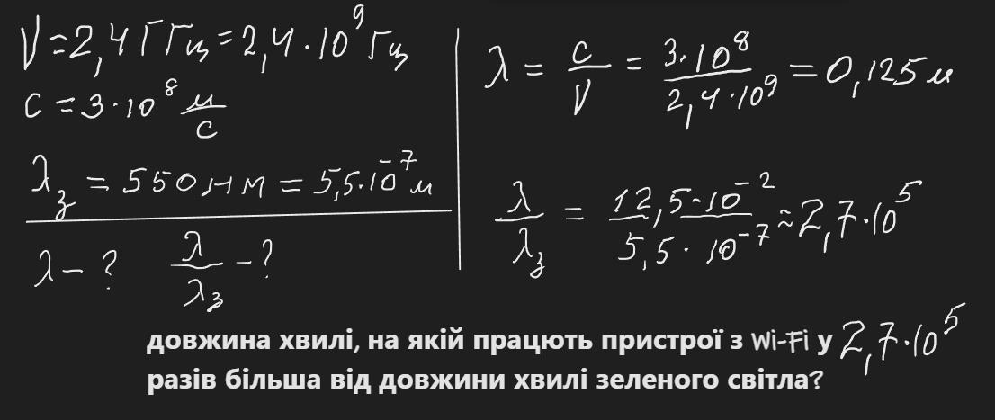 Частота на якій працють пристрої з Wi-Fi складає 2,4 ГГц. Яка довжина хвилі такого випромінення? В скільки разів вона відрізняється від довжини хвилі зеленого світла?