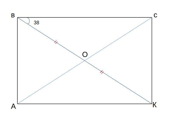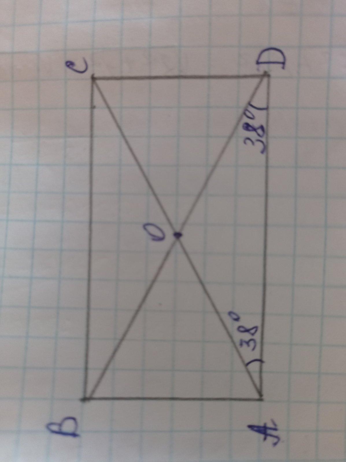 3°. У прямокутнику кут між діагоналлю та більшою стороною дорівнює 38°. Знайти менший з кутів, які утворено дiагоналями прямокутника.