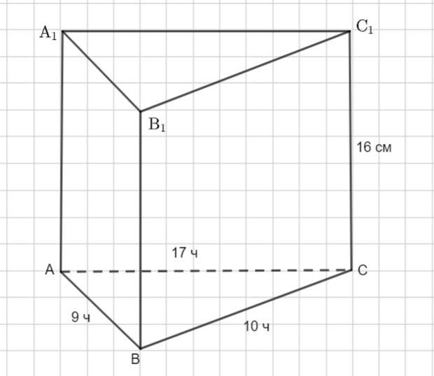 как 17 : 10 : 9, а боковое ребро равно 16 см. Площадь полной поверхности призмы равна 1440 см². Найти площадь боковой поверхности призмы.