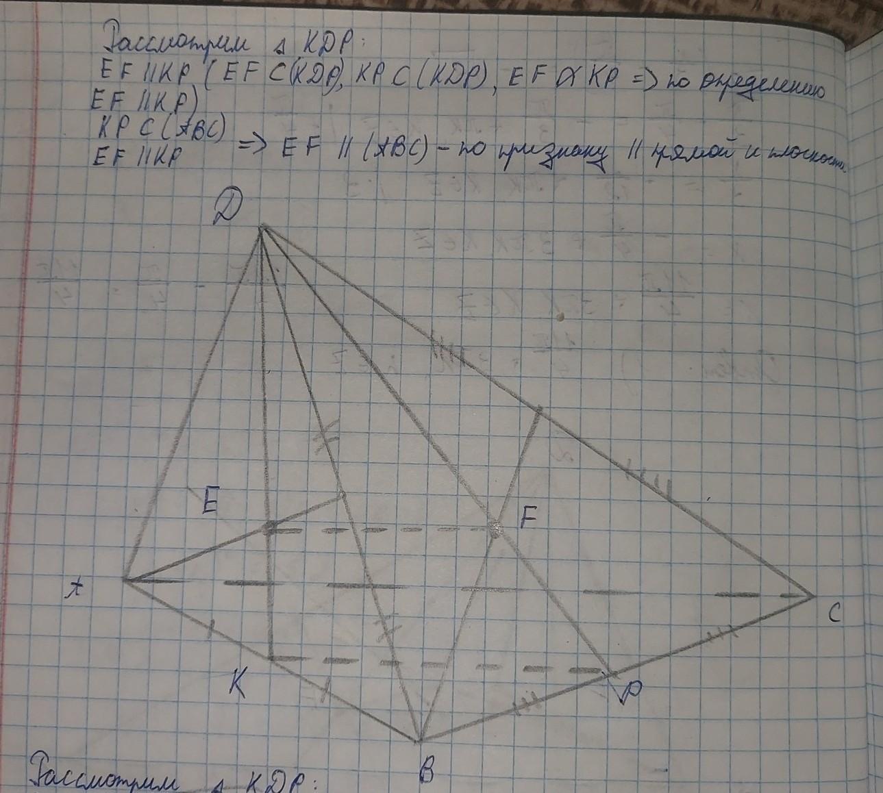 Медіани грані ADB тетраедра DABС перетинаються в точці Е, а медіани грані BDC - у точці F. Доведіть, що пряма EF паралельна площині АВС.