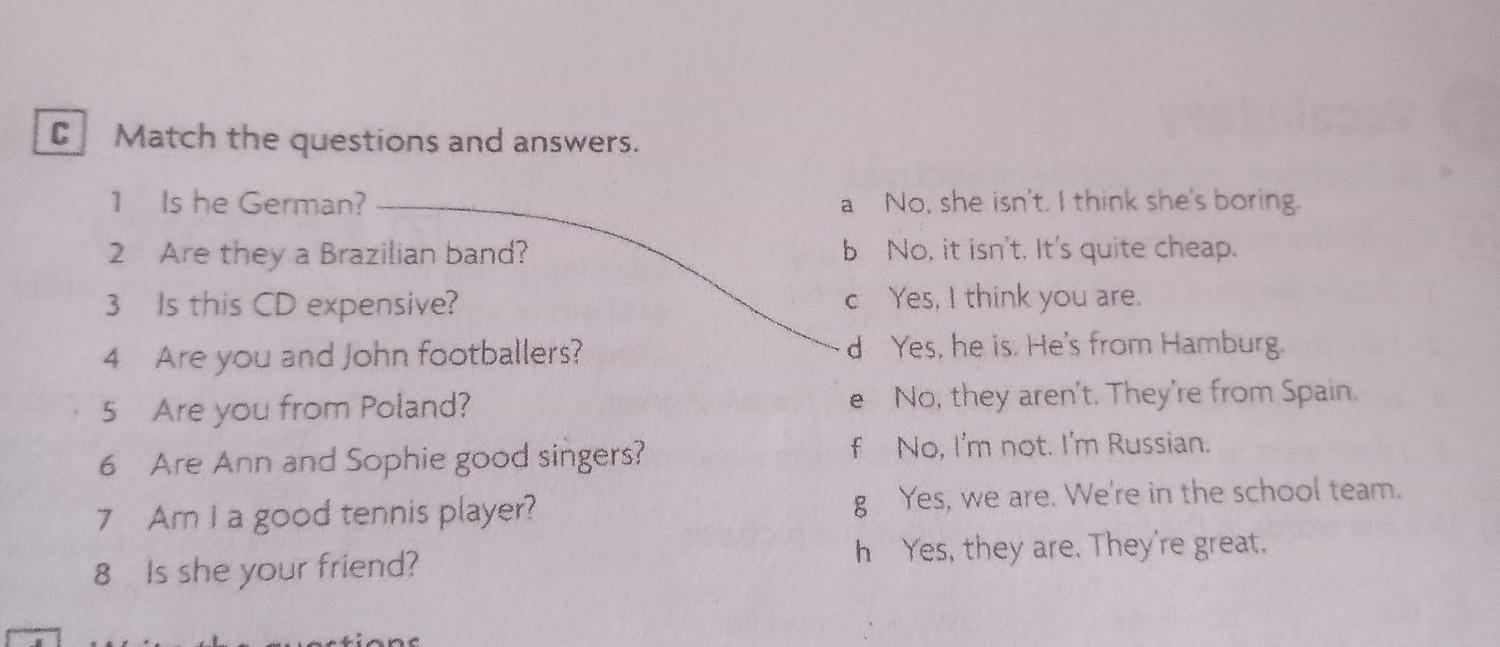 Match the questions and answers. Is he German? Are they a Brazilian band? Is this CD expensive? Are you and John footballers? Are you from Poland? Are Ann and Sophie good singers? Am I a good tennis player? Is she your friend?