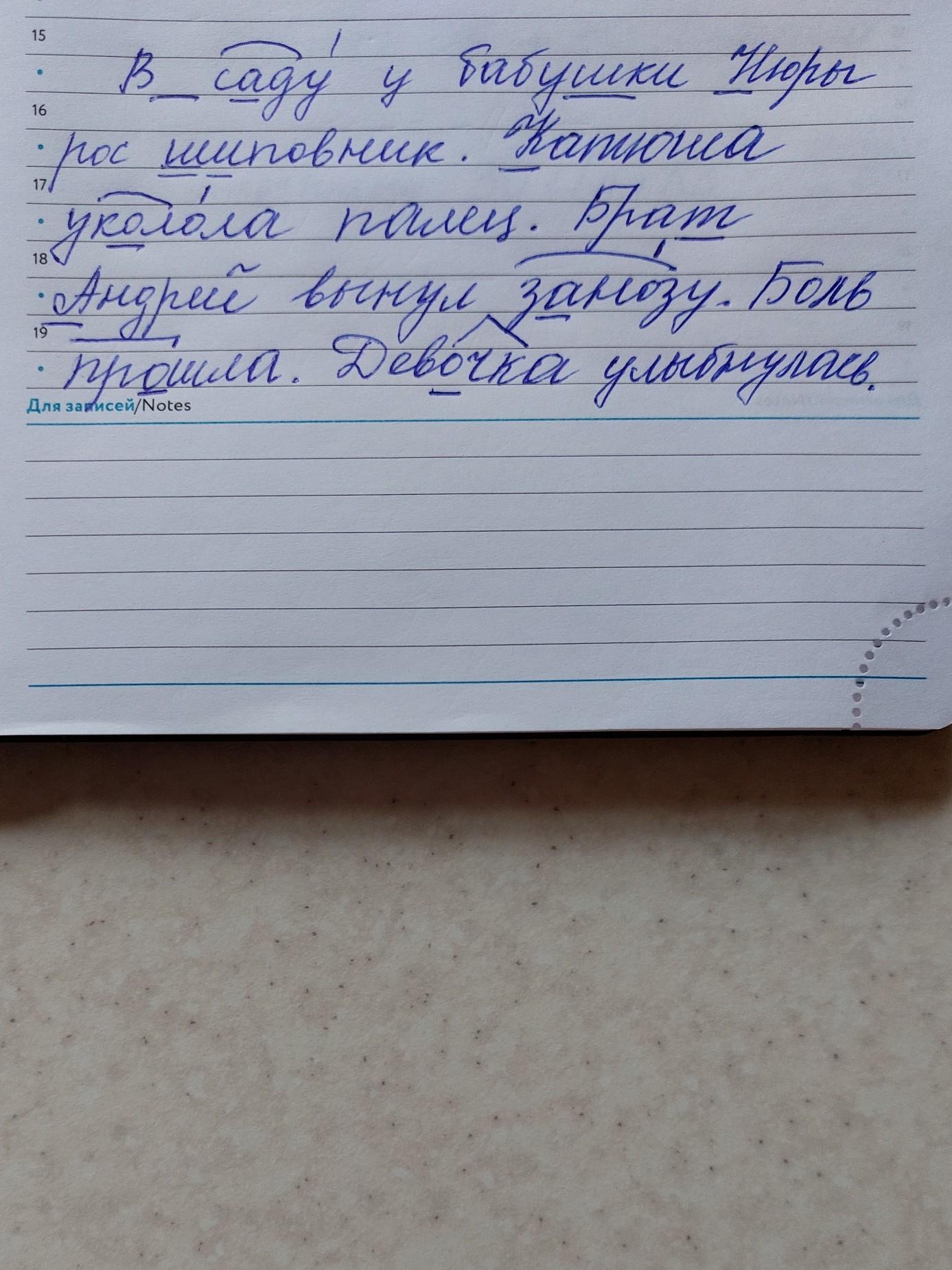 В саду у бабушки Нюры рос шиповник. У шиповника острые шипы. Катюша уколола палец. Брат Андрей вынул занозу. Боль прошла. Девочка улыбнулась.