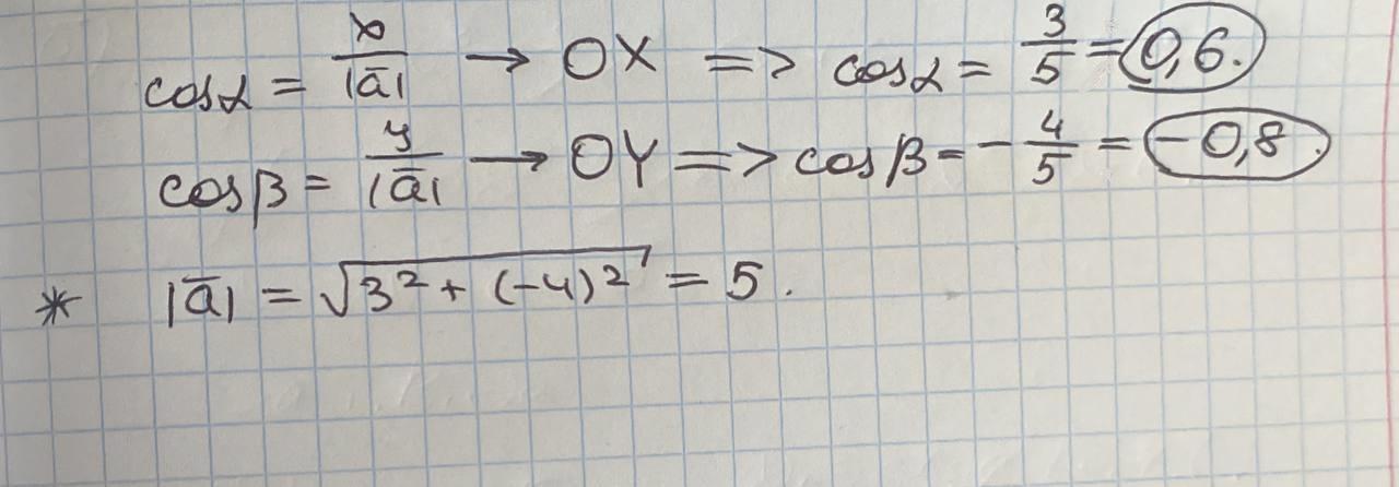 Знайдіть косинуси кутів між вектором →a=(3; −4) та осями координат. Результат запишіть в текстові поля десятковими дробами