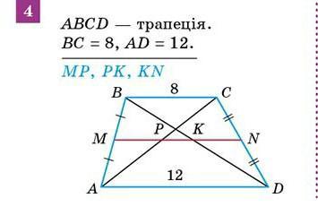 Так как MN - средняя линия трапеции, то она является средней линией ΔАВС и ΔВСD ⇒ МР=ВС:2=8:2=4 , NK=BC:2=8:2=4 .