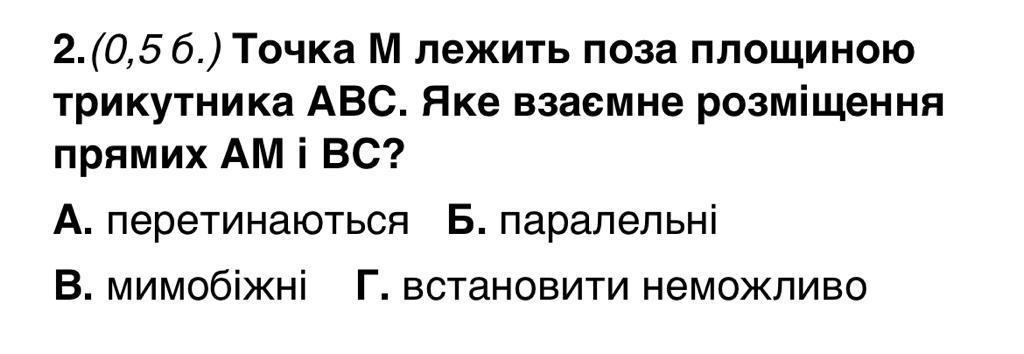 2. Точка М лежит за площадью треугольника авс. Какое общее расположение прямых ам и вс?