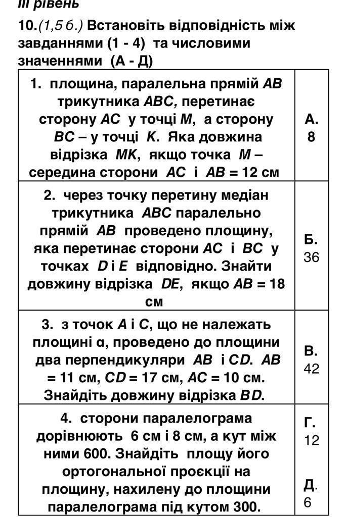 3. 3 точек А и С, не принадлежащих плоскости а, проведено к плоскости два перпендикуляра AB ICD. AB = 11 см , CD = 17 см , AC = 10 см . Найдите длину отрезка B D. 4. стороны параллелограмма равны 6 см и 8 см, а угол между ними 600. Найдите площадь его ортогональной проекции на плоскость, наклоненную к плоскости параллелограмма под угло