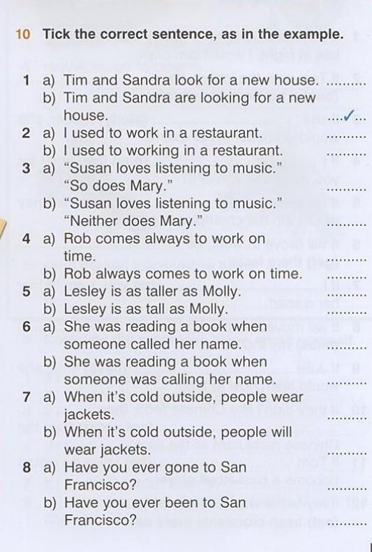 to 10 Tick the correct sentence, as in the example. 1 a) Tim and Sandra look for a new house. b) Tim and Sandra are looking for a new house. 2 a) I used to work in a restaurant. 3 b) I used to working in a restaurant. a) "Susan loves listening to music." "So does Mary." b) "Susan loves listening to music." "Neither does Mary." 4 a) Rob comes always to work on time. b) Rob always comes to work on time. 5 a) Lesley is as taller as Molly. Lesley is as tall as Molly. b) 6 a) She was reading a book when someone called her name. b) She was reading a book when someone was calling her name. 7 a) When it's cold outside, people wear jackets. b) When it's cold outside, people will wear jackets. 8 a) Have you ever gone to San Francisco? b) Have you ever been to San Francisco? ........