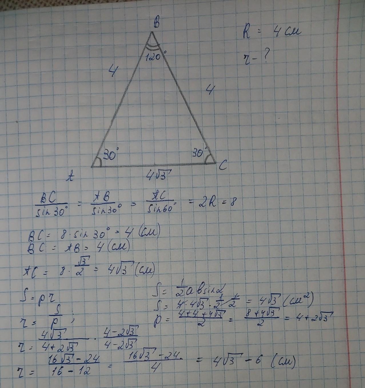 Кут при основі рівнобедреного трикутника дорівнює 30. Радіус кола, описаного навколо трикутника, дорівнює 4 см. Визначити радіус кола, вписаного в даний трикутник.