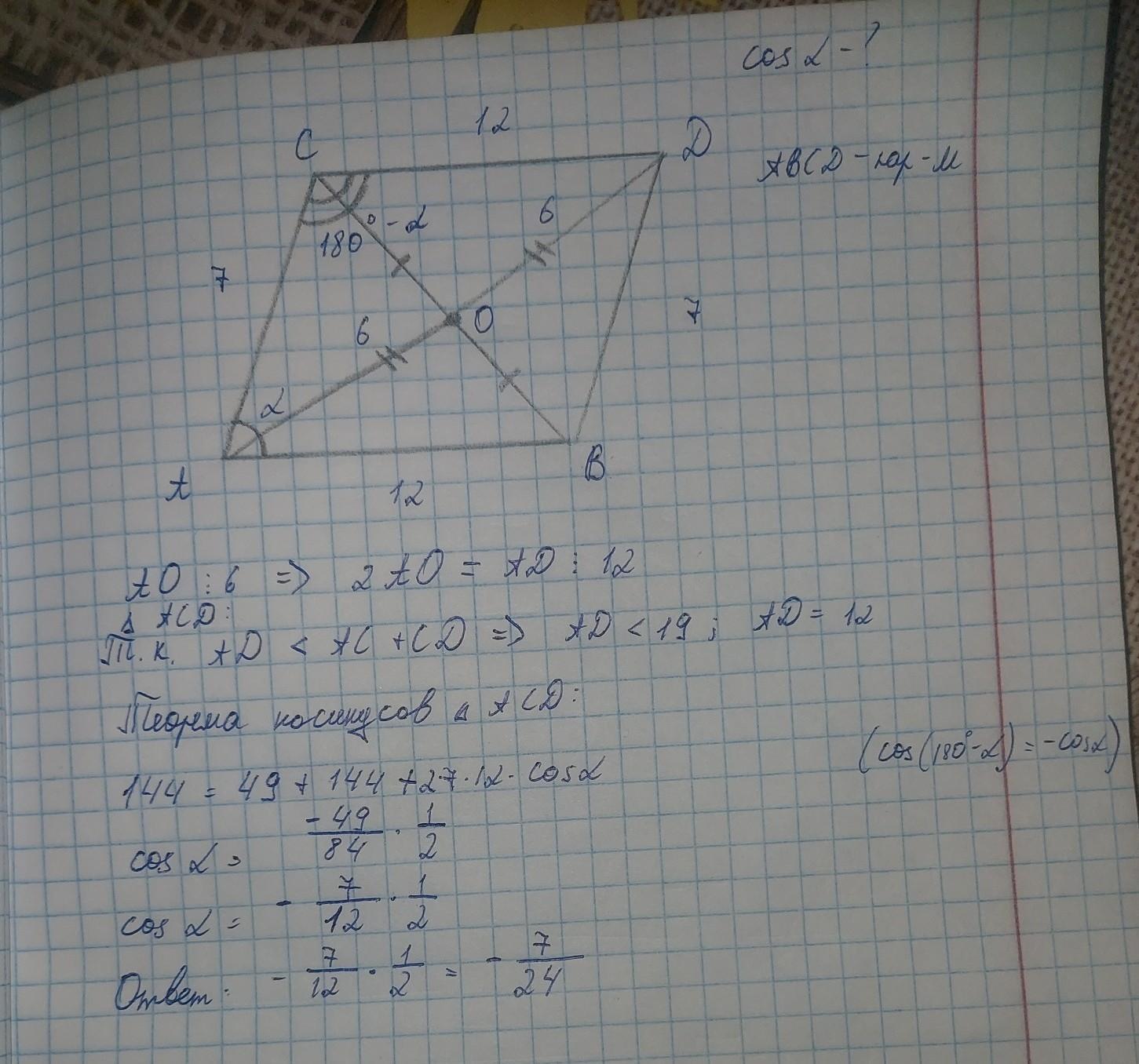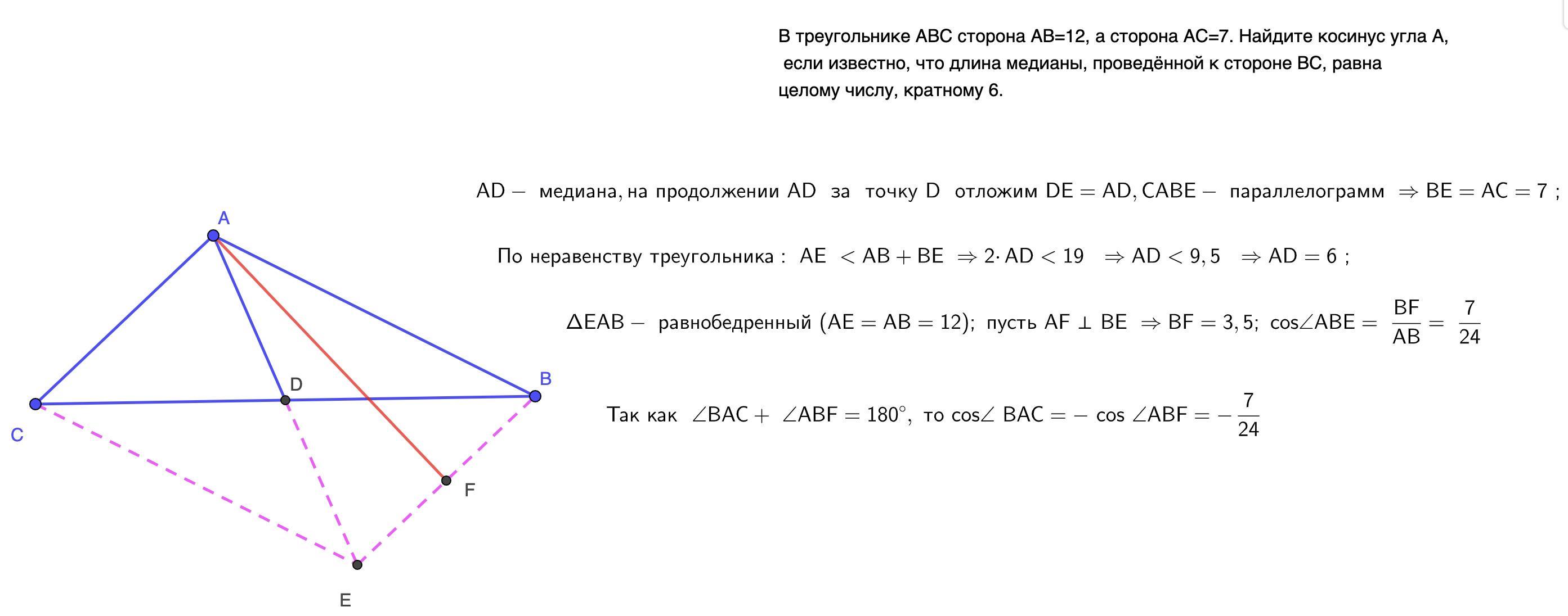 ПОМОГИТЕ! ДАЮ 100 баллов. В треугольнике ABC сторона AB=12, а сторона AC=7. Найдите косинус угла A, если известно, что длина медианы, проведëнной к стороне BC, равна целому числу, кратному 6.