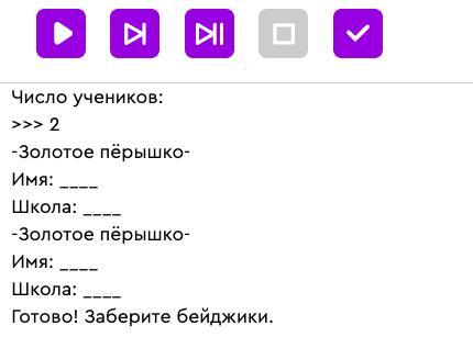 «Школа: ____». Напиши программу, печатающую бейджики участников как на картинке. В завершении программа должна печатать: