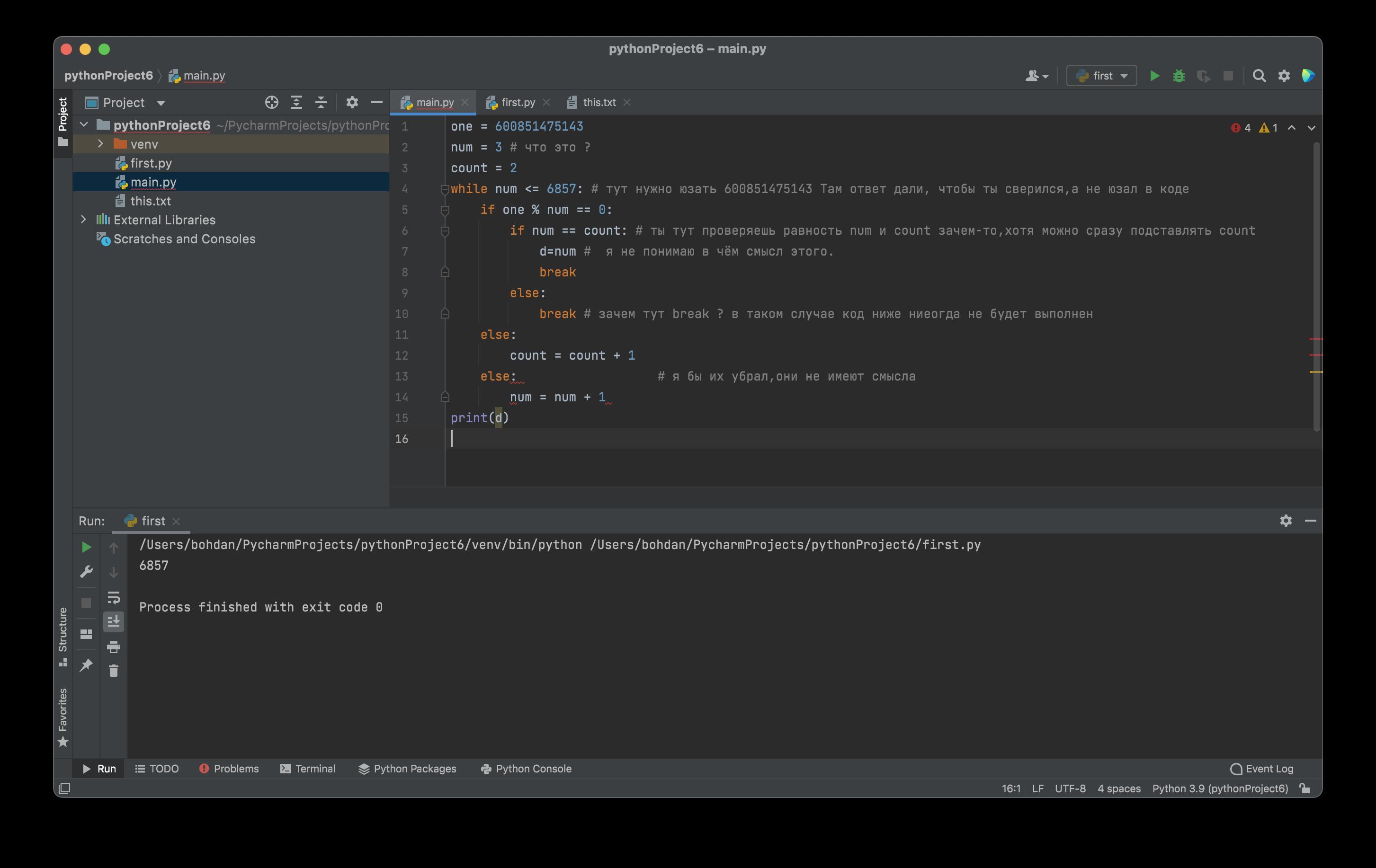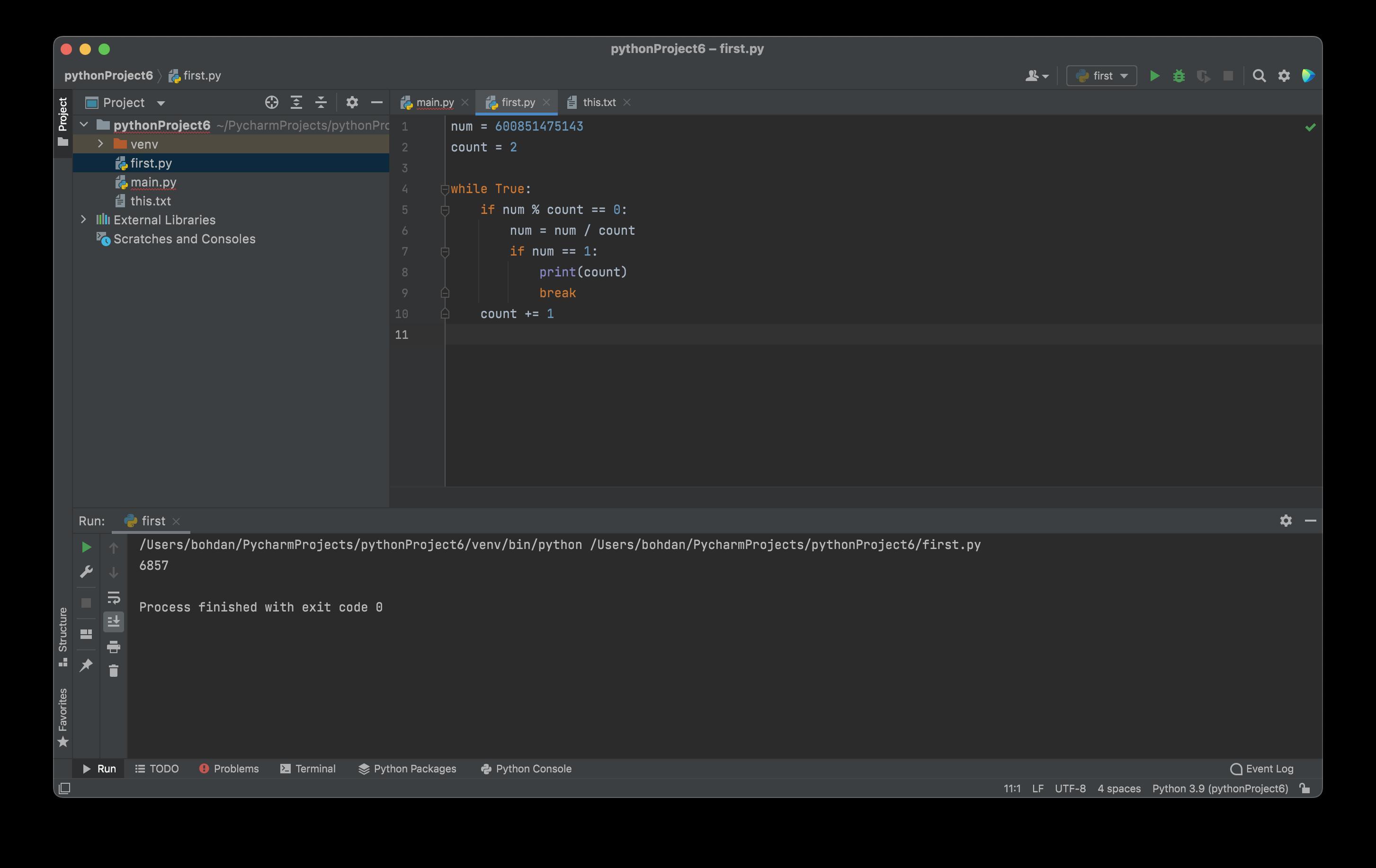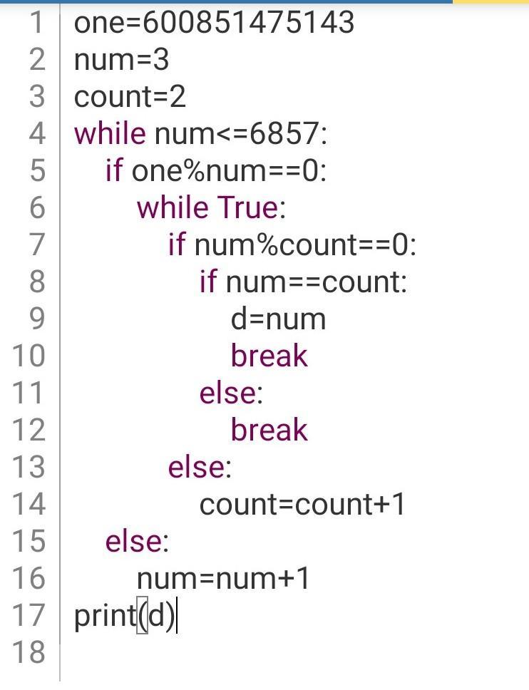 делится ли число на число без остатка,а в 6 уже делим 600851475143 на count.