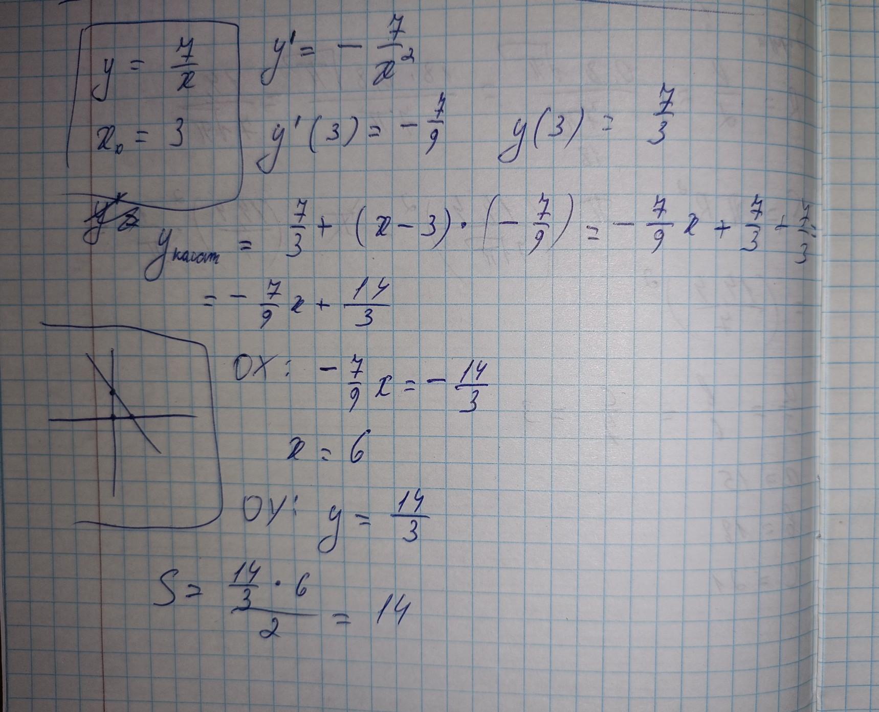 найдите площадь треугольника ограниченного осями координат и касательной к графику функции y=7/x в точке с абсциссой x0=3