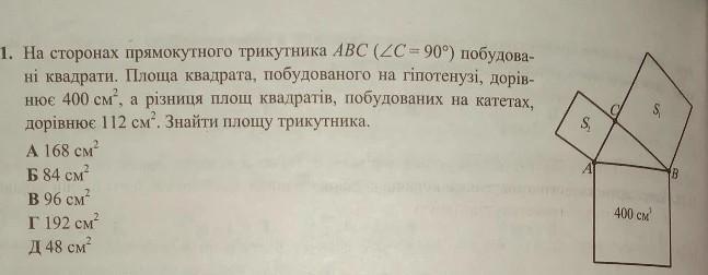 На сторонах прямоугольного треугольника АВС (<C=90°) построены квадраты. Площадь квадрата, построенного на гипотенузе, равна 400 см², а разница площадей квадратов, построенных на катетах, равна 112 см² .Найти площадь треугольника.