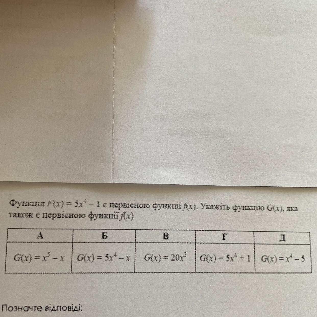 Функція F(x) = 5x² - 1 є первісною функції f(x). Укажіть функцію G(x), яка також є первісною функції f(x)